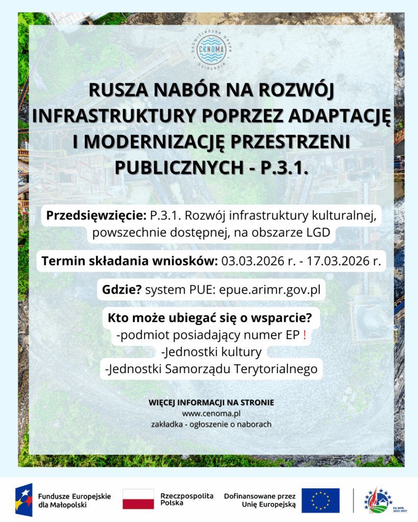 📢 Stowarzyszenie Nadwiślańska Grupa Działania „E.O.CENOMA”, działające na obszarze: Gmina Szczurowa, Gmina Drwinia, Gmina Rzezawa, Miasto i Gmina Koszyce oraz Miasto i Gmina Kazimierza Wielka ogłasza nabór wniosków numer 752 880 📄 w ramach Planu Strategicznego dla Wspólnej Polityki Rolnej na lata 2023–2027 🗓️ dla interwencji I.13.1 LEADER/Rozwój Lokalny Kierowany przez Społeczność (RLKS) – komponent Wdrażanie LSR.